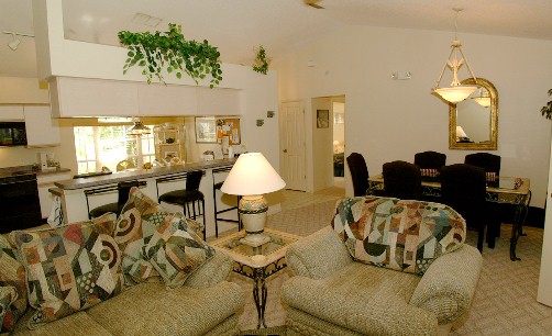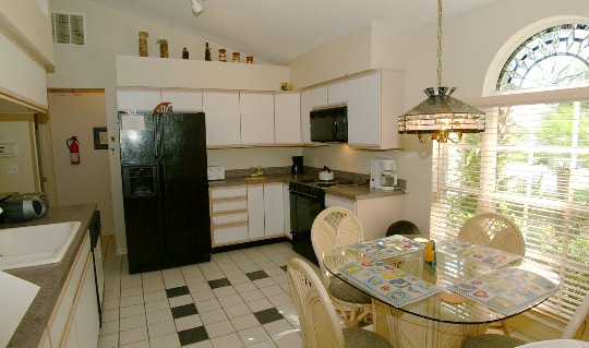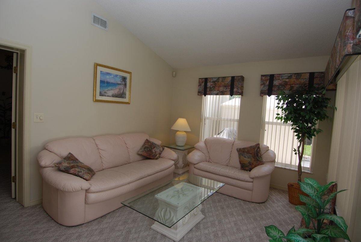 | Den - this is a spacious room that is tastefully decorated and leads out to the pool from the villa. The patio doors are fitted with a child alarm for the safety of children entering the pool area without adult knowledge. This room also has a 3 piece leather suite that can be converted into a double sofa bed if your party requires and has a 32 inch TV for your enjoyment. | Living/dining room - this room is in open plan style adjoining the kitchen and is the focal point within the villa. The contemporary dining table seats 6 guests. There is also a 3 piece suite round the second TV and video. Ideal if the children wish to watch something different on TV! This room also has seating for 3 at the breakfast bar. | Kitchen - comes complete with large fridge freezer with ice maker and water dispenser - great for those cool drinks by the pool! For your convenience there is a large oven with grill as well as a microwave oven,dishwasher and waste disposal. There is also a dining table that seats 4 and comes fully equiped with all the cutlery and plates you would need for your stay. |